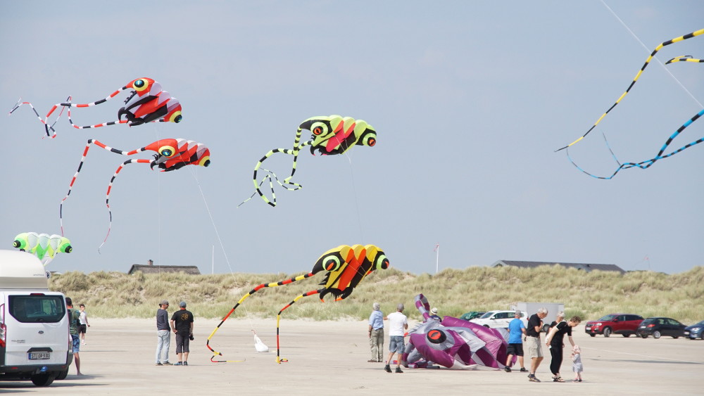 Bei passendem Wind liften die schon mal zwei 5m-Turbinen oder die Knüpferschlange, ohne zu monstermäßige Zugkräfte zu erzeugen. Ich bin halt nicht der Typ, dem die Zugdrachen nicht groß und zugkräftig genug sein können. Statt in eine Leine x große Schmuckteile einzuhängen, stelle ich lieber einen oder zwei Lifter mehr an den Himmel.