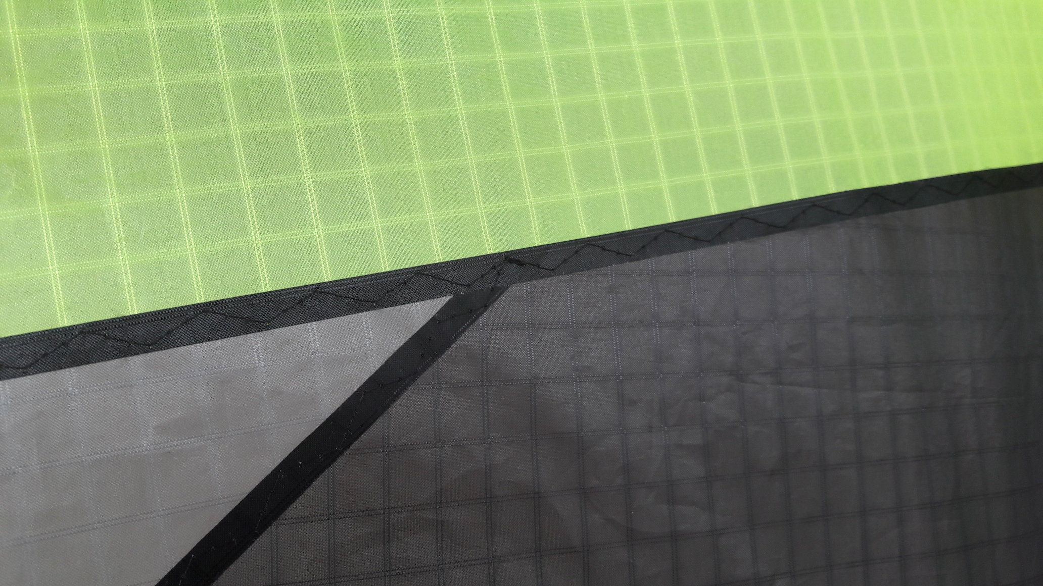 Hier sieht man die Nähte in relativ großer Aufnahme im Gegenlicht. Ober- und Unterfaden liegen nicht direkt aufeinander und man sieht auch hier, dass genau der selbe Richtungswechsel der Verschlingung auftaucht wie bereits oben besprochen.