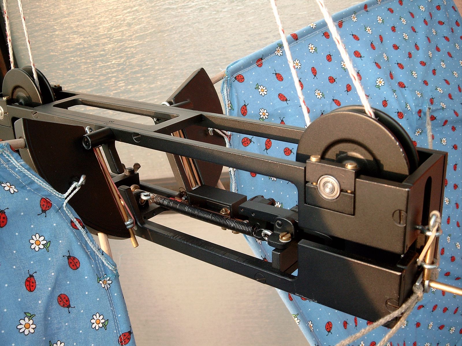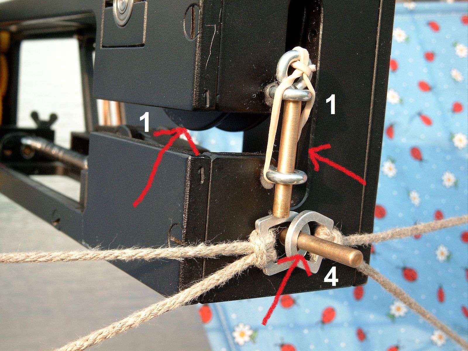 1). Die Fähre wird durch die beiden seitlichen Schlitze in die Schnur eingehängt und durch die beiden Stifte gegen herausrutschen gesichert.