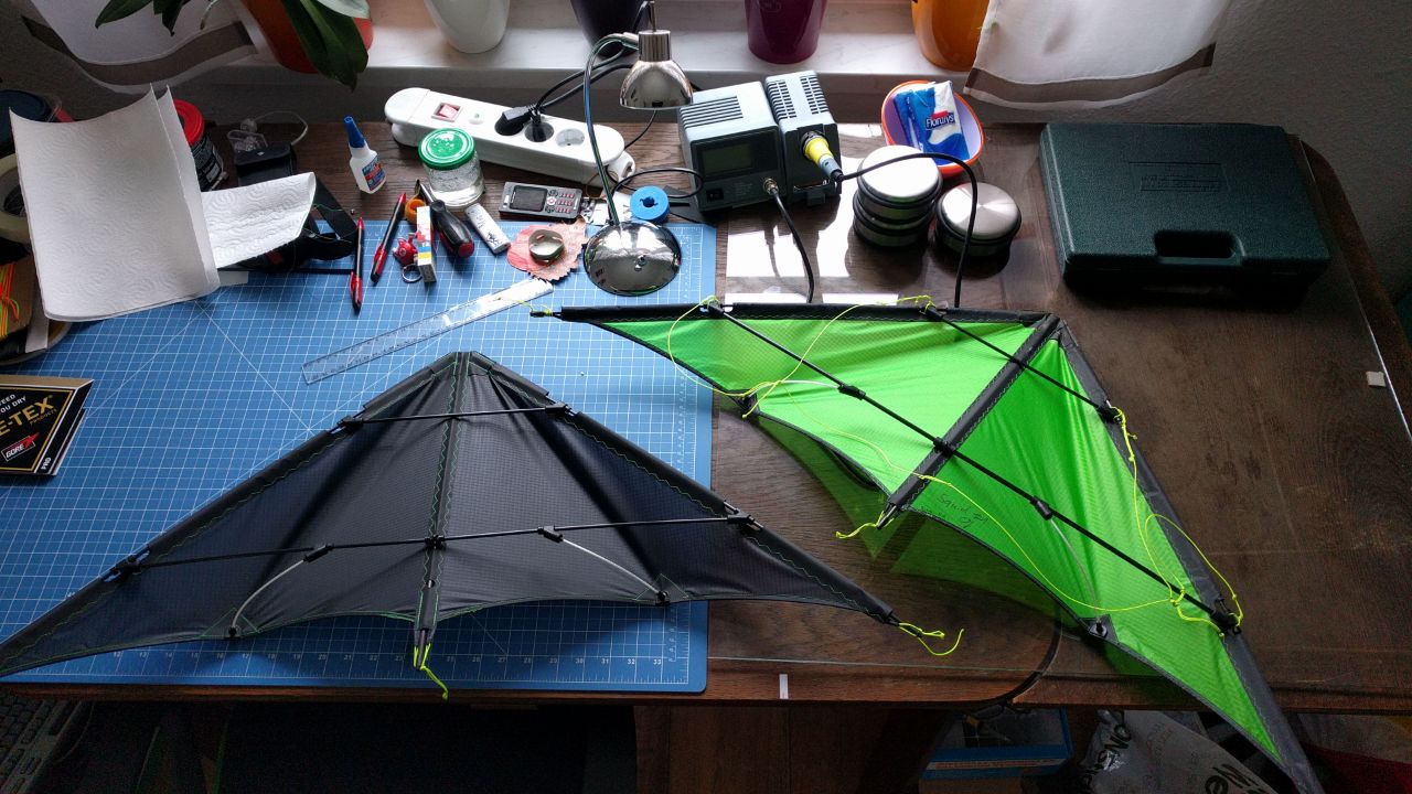 Ich habe gleich letztes Jahr meinen ersten Squid gebaut (im Bild der grüne). Beim ersten passenden Wind auf die Wiese und Probe... Ergebnis, das Fluggerät fliegt nicht, undefiniertes trudeln.