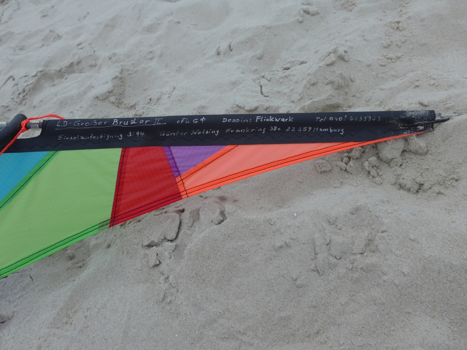 am 17. Juli 2016 meinen ersten echten „Wolsing“ Drachen erhalten.Ein wunderschönes Exemplar aus der Long Dart Familie, ein Long Dart Großer Bruder in Flickwark welcher 3/94 von Günter erbaut wurde.