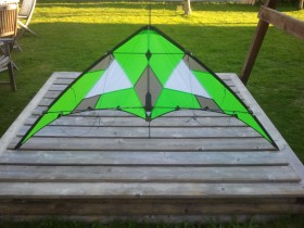 Beim Design habe ich mich nun auf zweifarbig festgelegt - Grundfarbe in der einen und die drei Rauten (Augen + die mittlere Raute) in der anderen Farbe. Ursprünglich wollte ich die Flügelspitzen auch noch wie die Rauten haben, aber das stellt Michael so nicht mehr her (zumindest nicht beim 1.7), da wohl sonst auf zu engem Raum 4 Nähte zusammenfallen und dadurch das Segel an der Stelle nicht so schön “fällt“.
