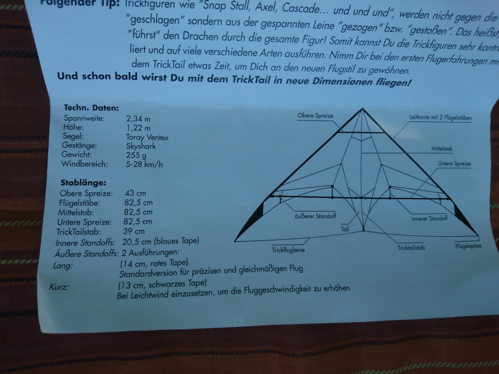 Bin eh nicht so der Trickflieger und hab den das Ding damals nur gekauft, als der örtliche Drachenladen pleite ging - war glaub ich ein Schnäppchen. Meinem fliegerischen Unvermögen ist dann wohl geschuldet, dass da was kaputt ist bzw. fehlt.