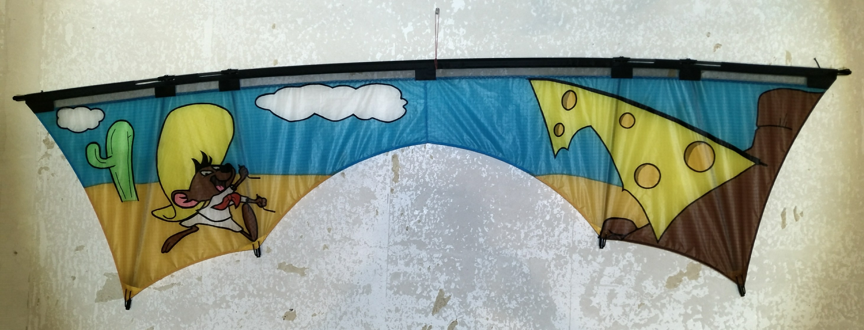 Da ich in meiner Kindheit unter anderem mit der Zeichentrickserie "Speedy Gonzales" aufwuchs, war sofort die Idee für das Design geboren. Speedy Gonzales als Comicfigur war gesetzt. Der sollte einen Kase-Drachen fliegen.