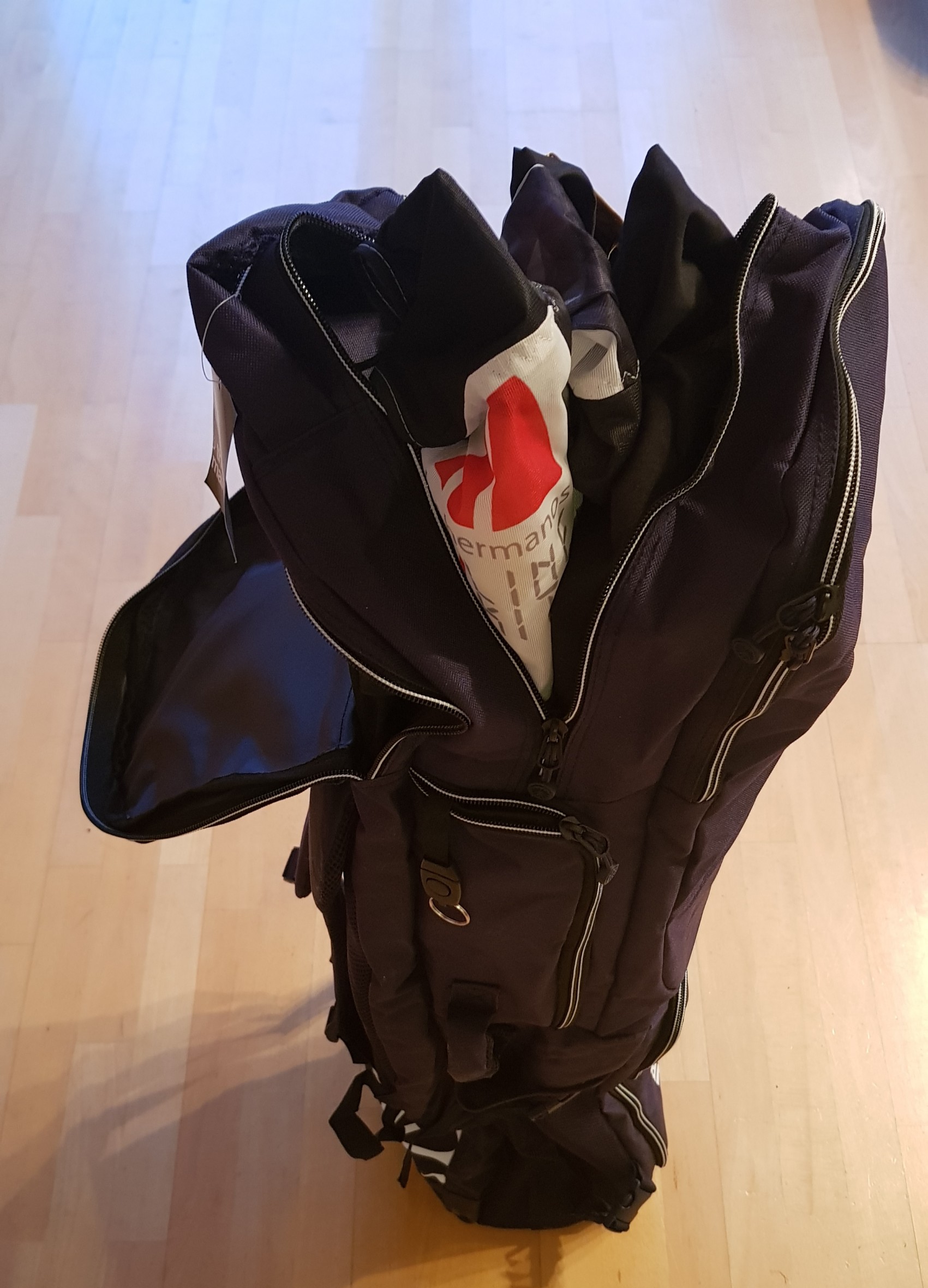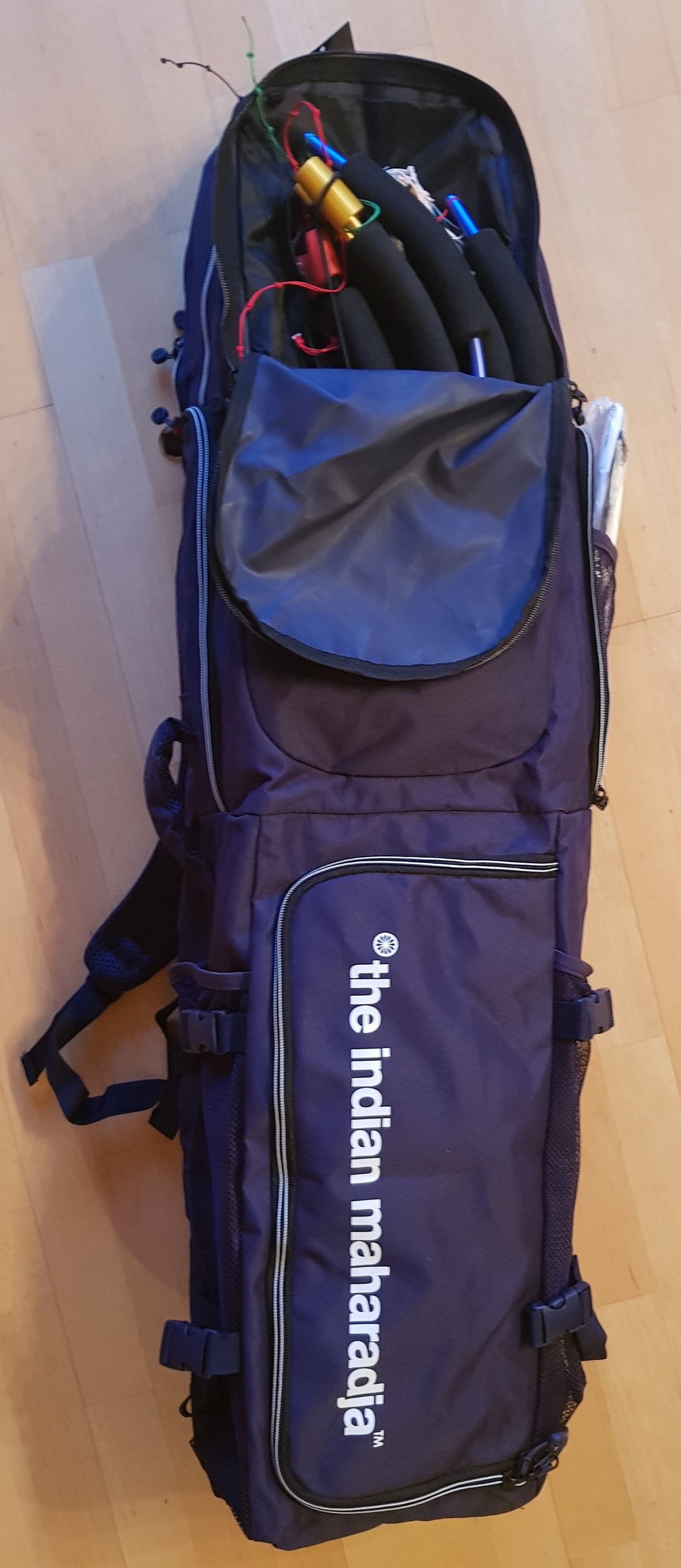 Drachentaschen sollten für auch als Rucksack auf dem Radel tragbar sein. Womit wir wieder bei Hockeyschläger-Taschen - für Vierleiner - wären. Deren Schlägerfach ist meist nicht so groß. Doch bei der Indian Maharadscha Large konnte ich durch das Auftrennen eines Bodens neben dem Schlägerfach eine weitere Tasche schaffen. Da gehen jetzt locker 8 Vierleiner rein. Dazu gibt es weitere Taschen für Handles, für Wickler und für Kleinzeug. Passt super!
