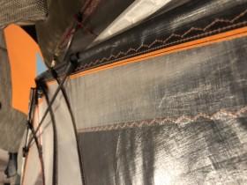 Das Segel ist aus 50/34gr. Cuben mit schwarz lackiertem PM02 am Schwalbenschwanz.