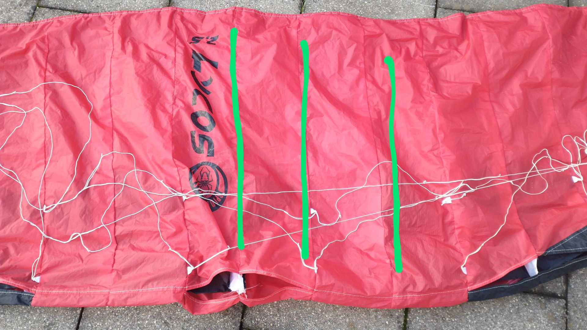 Der FidgetFighter hat ein leichtes Profil in der Mittelnaht und ich muß wohl ca. 1 mm neben der vorgesehenen Naht genäht haben. Dadurch konnte sich das leichte Profil ( im Nasenbereich 6 mm und unten ca. 3 mm) enger genäht) nicht voll ausprofilieren konnte und der Drachen seinen Kielstab dadurch nicht in die richtige Richtung gewölbt hat.