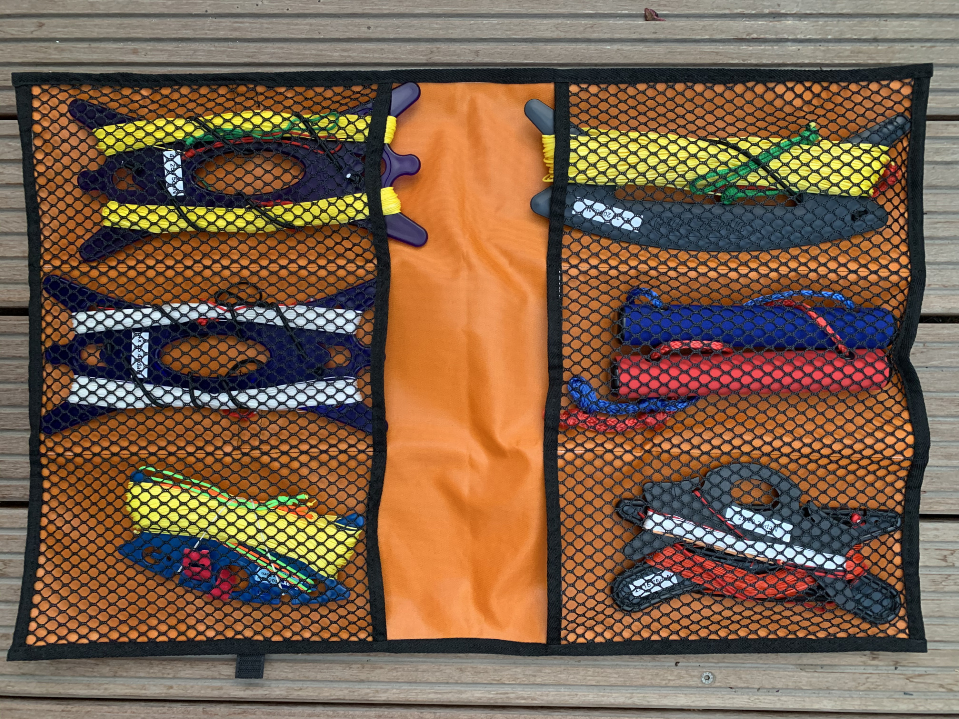 Winderbag, Prototyp No 2. Noch nicht perfekt. Da sind ein paar Details noch zu verbessern, aber für die Michael Tiedtke-Sammlung passt es bestens. Die finale Version bekommt 8 Taschen für Rev-Handles und -Leinen.