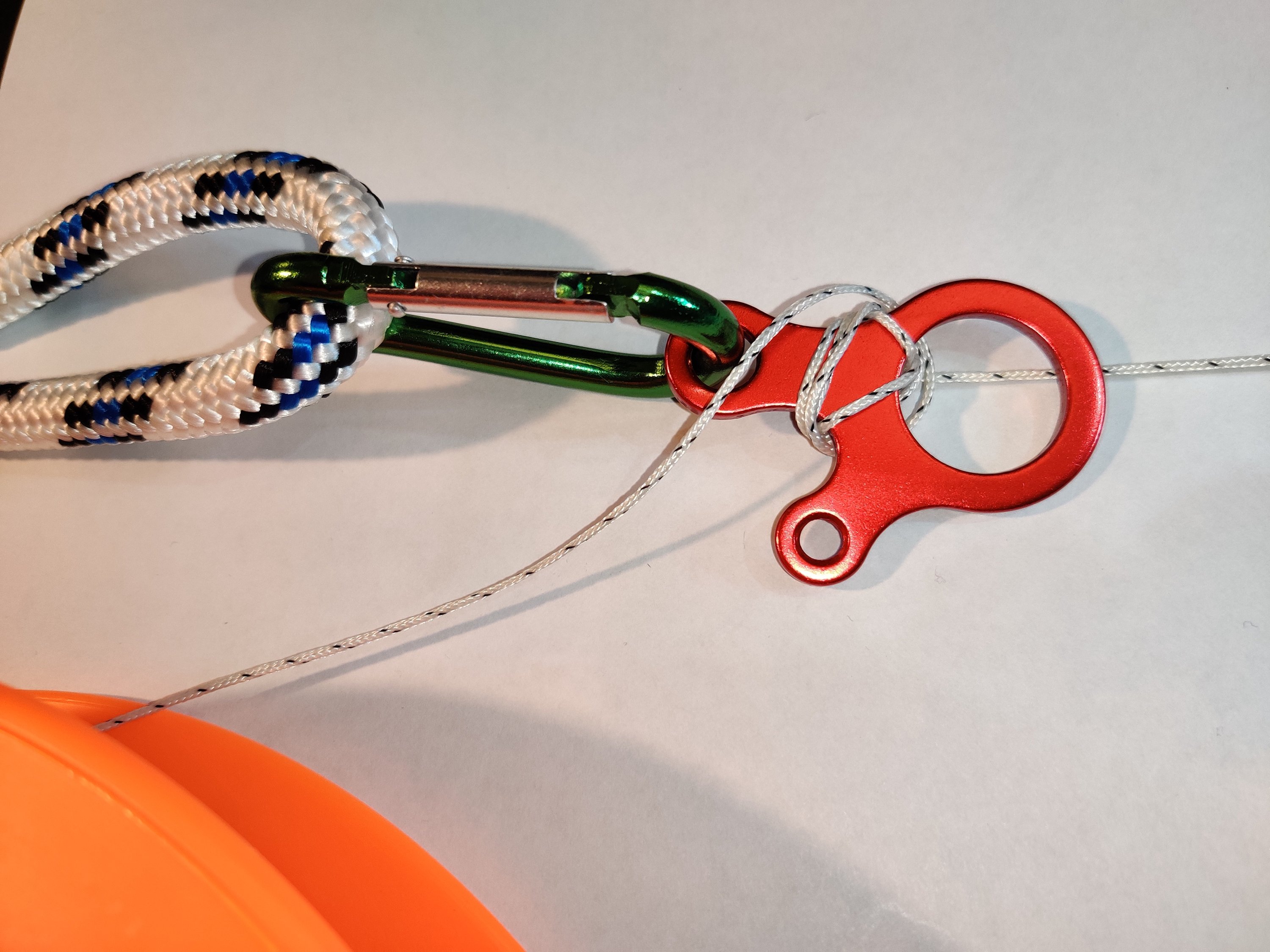 -Auf die Idee Abseilachter bin ich gar nicht gekommen, ich habe die Idee von @AndreasL ausprobiert und hier illustriert, den Wiesentest mache ich die Tage. Ich denke, dass die Sache bei mittlerem Wind und Einleinern auch ohne Buchtknoten auf dem Karabiner ausreicht. -
