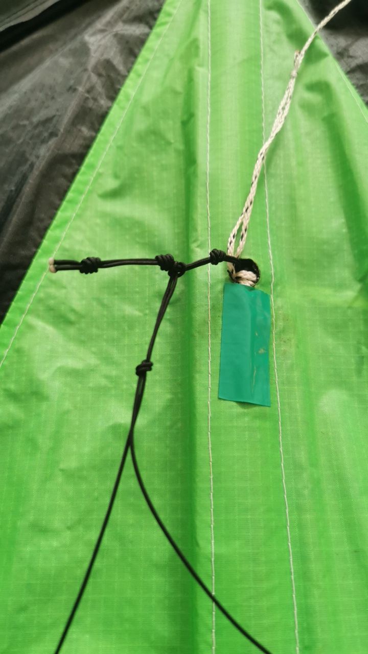 Die Waage ist an zwei Punkten am Kielstab befestigt und nur jeweils einmal an der Leitkante. Die unteren Waagepunkte sind mit einer durchgehenden Leine verbunden, sodass ich die Position der Ringe zum Kielstab verschieben kann. Um mir ein bisschen Spielraum beim Anstellwinkel zu verschaffen war meine Idee eine Knotenleiter in die obere Mitte einzubauen. Aktuell würden sich aber beide Seiten die eine Knotenleiter teilen, was beim Kurvenflug ggf. eine trägere Reaktion verursacht?? (noch nicht getestet)