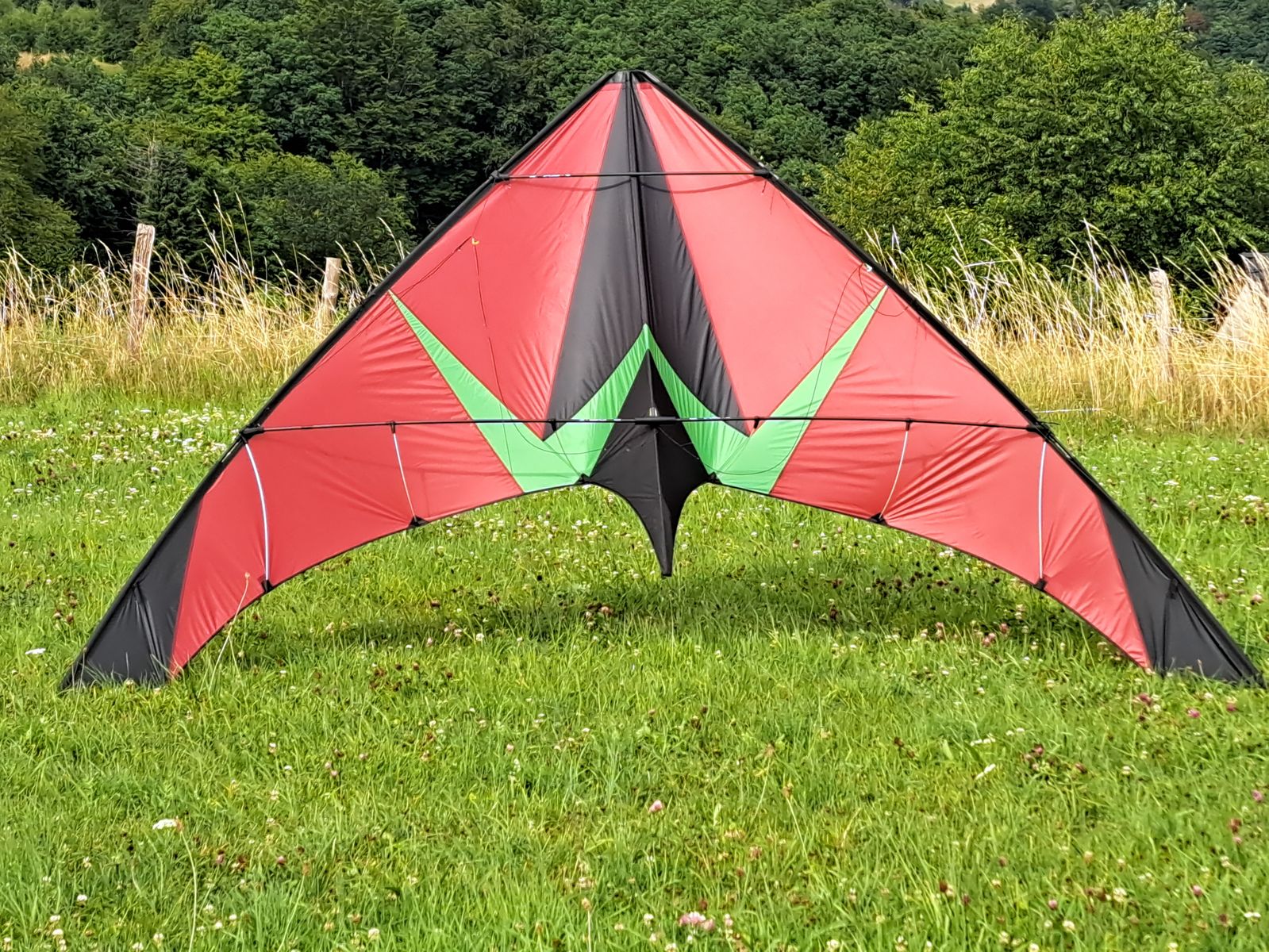 Es ist der Nachbau meines ersten selbst gebauten Drachen, allerdings mit anderen Farben und ein paar Verbesserungen.