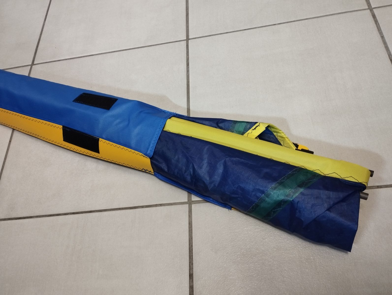 Der Textilbezug lässt sich ausklappen, sodass der Kite auch dann hineinpasst, wenn ich den Kiel nicht auseinandernehme.
