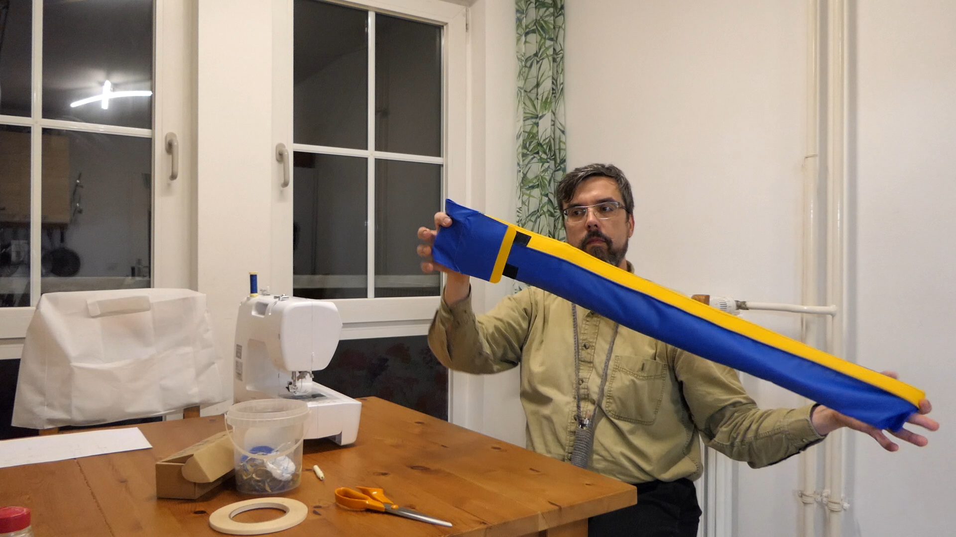 Zum Packen in einen Koffer habe ich einen harten Köcher aus 56 cm langem Kunststoffrohr (63 mm Innendurchmesser) gebastelt.