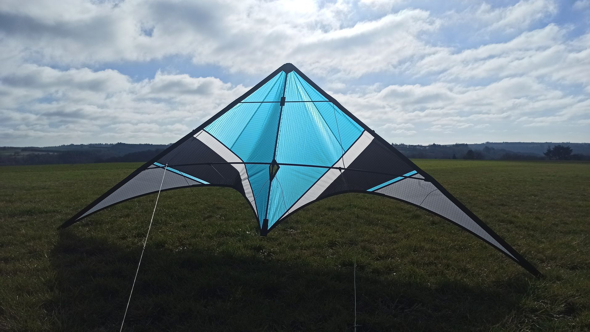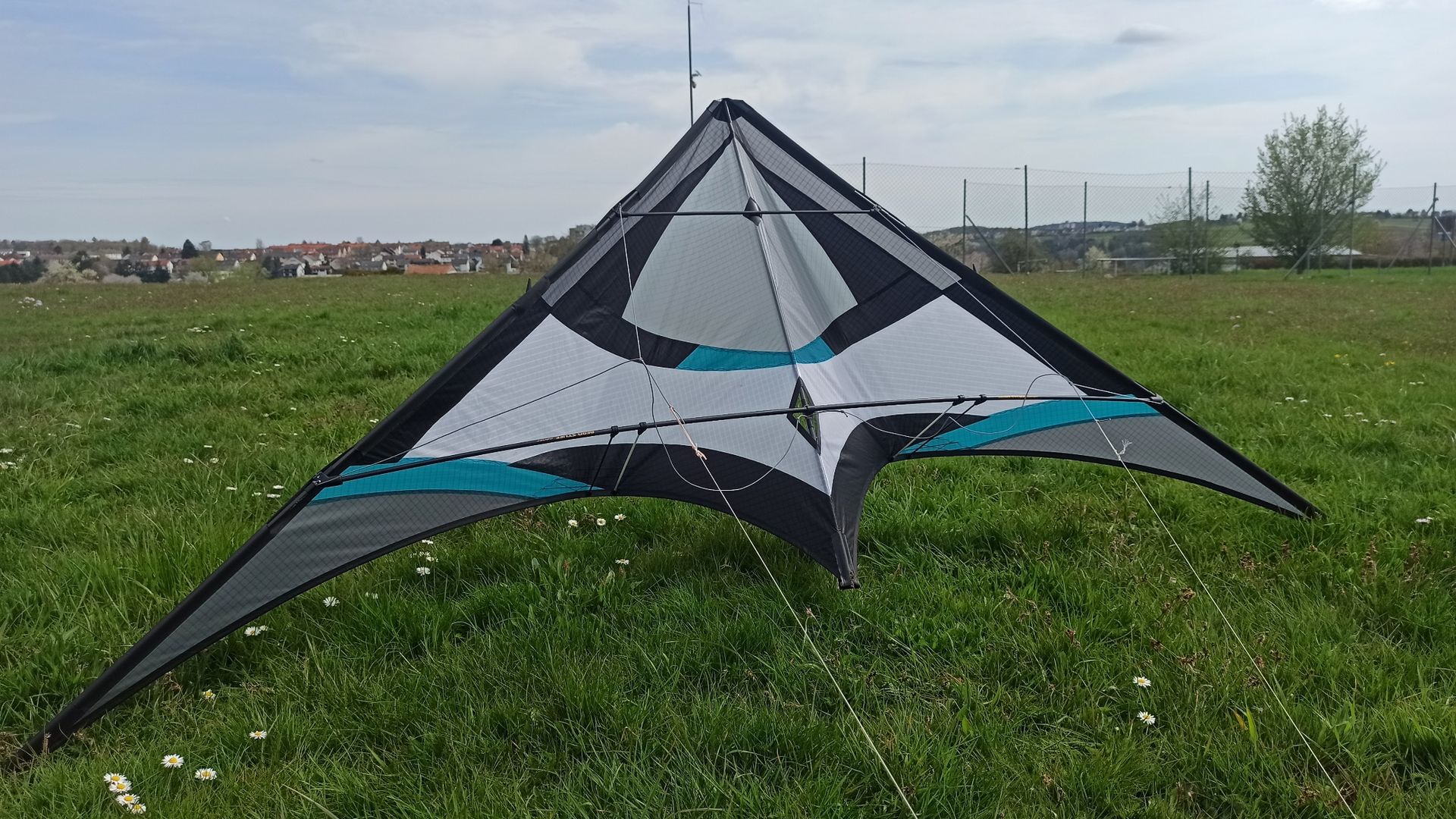 Das ist noch nicht einmal eine richtige Biegung nach unden 😉 (Vom Kreuz aus gesehen). Die meisten moderne Trickkites die ich kenne, haben in der UQS eine stärkere Biegung, was auch so gewollt ist.