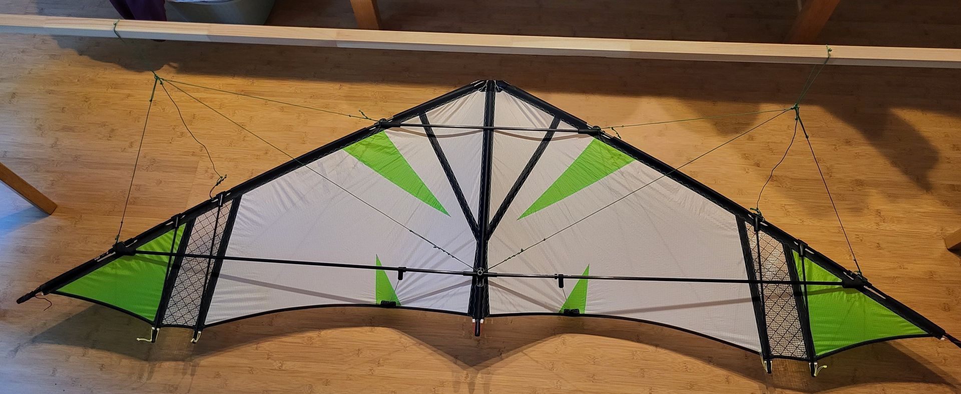 Rechte Seite ist neu. Zwei Fragen habe ich aber noch, wie dolle spannt man die Saumschnur? Und ist das richtig dass die Waage vom winglet locker ist? Meine Idee ist dass der Wind die spannt, damit der Flügel bauchig wird!?