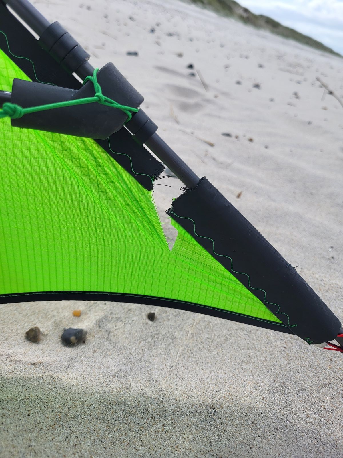 es soll irgendwie alles nicht sein. Ich war heute bei guten 5bft am Strand um den Fusion mal von der Leine zu lassen. Er ist erst über den Zenit geflogen und hat am seitlichen Windfenster Rand schnell die Strömung verloren und ist runter gesegelt. Ich habe dann an der OQS einen Knoten von der Knotenleiter an der LK weiter weg gestellt. Flugverhalten fühlte sich besser an. Bei einem der Abstürze muss allerdings das Segel gerissen sein. Frage an euch, kann man das flicken oder ist die Stelle doof?