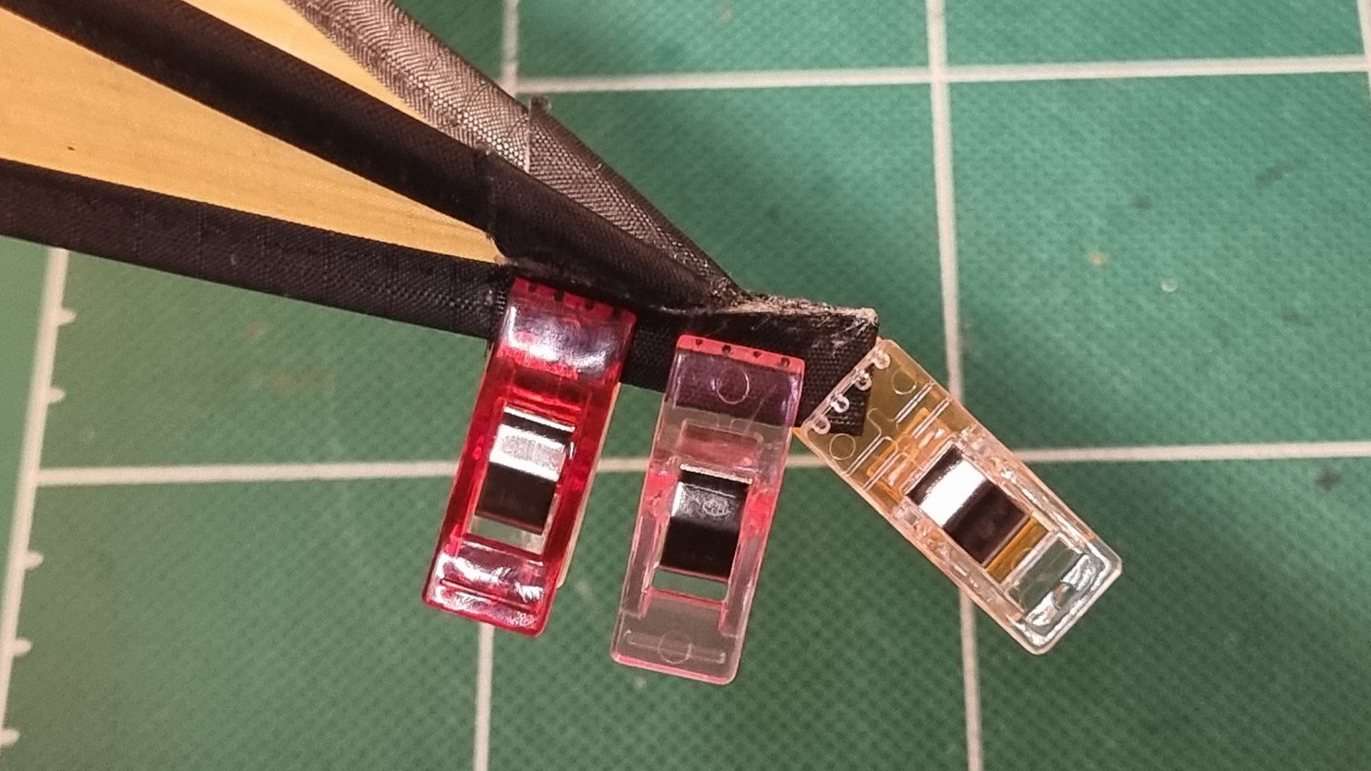 Mit Stäben im Drachen war dann leider das Nähen auch schwieriger bzw. teilweise unmöglich. Ich habe am Kiel Dacron gefaltet und festgeklebt.