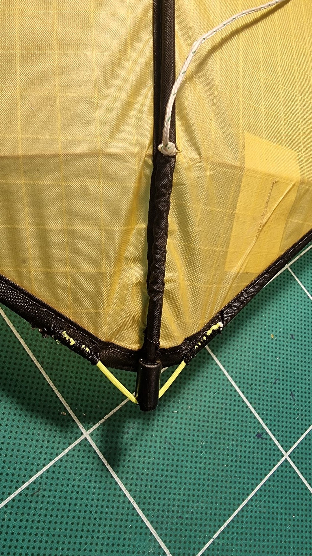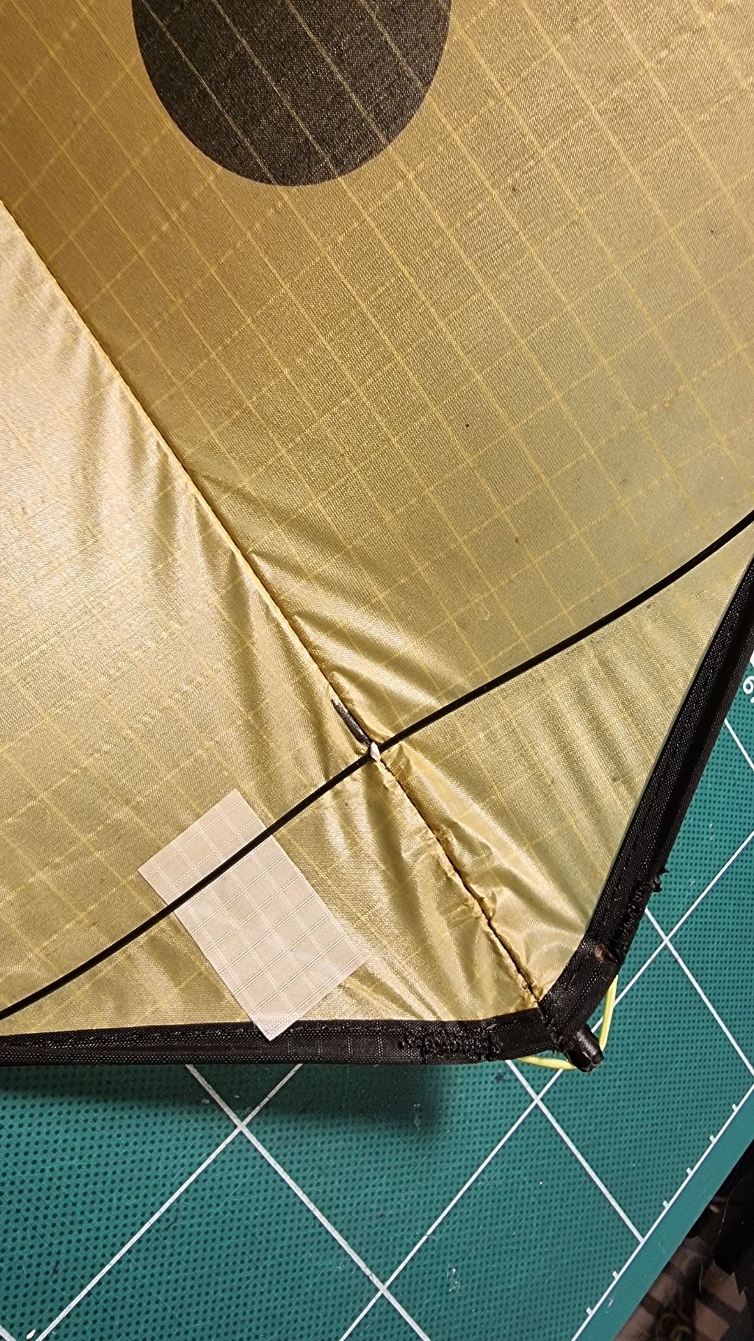 An der Nase habe ich den Tunnel mit einem Lötkolben abgeschnitten und eine Spannschnur angenäht. Das war aufgrund der Stäbe im Drachen nicht so einfach und sieht auch nicht so gut aus, wie wenn man ungehindert nähen kann. Dann eine Splittkappe auf den Kielstab und gespannt.
