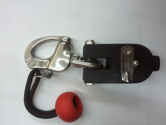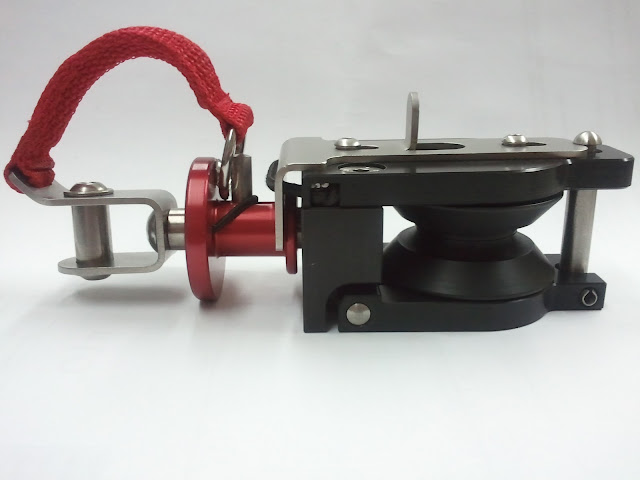 Das automatisierte Auslösen durch z.B. eine Verbindung zum Buggy erfolgt über das rote Gurtband mit dem Edelstahlring welcher in geschlossenem Zustand zwischen Edelstahlstift und Halbrundkopf des rot eloxiertem Auslosers liegt. Hier wird ein Karabiner eingehangen mit einem Gurtband welches wiederum an der Buggydeichsel befestigt wird.....btw. dieser sollte das "Original" aus dem Zubehör für den Splitter sein, da dieser entsprechend getestet wurde durch Gerd und Maik, damit er sich nicht irgendwie am Splitter verhackt !!!