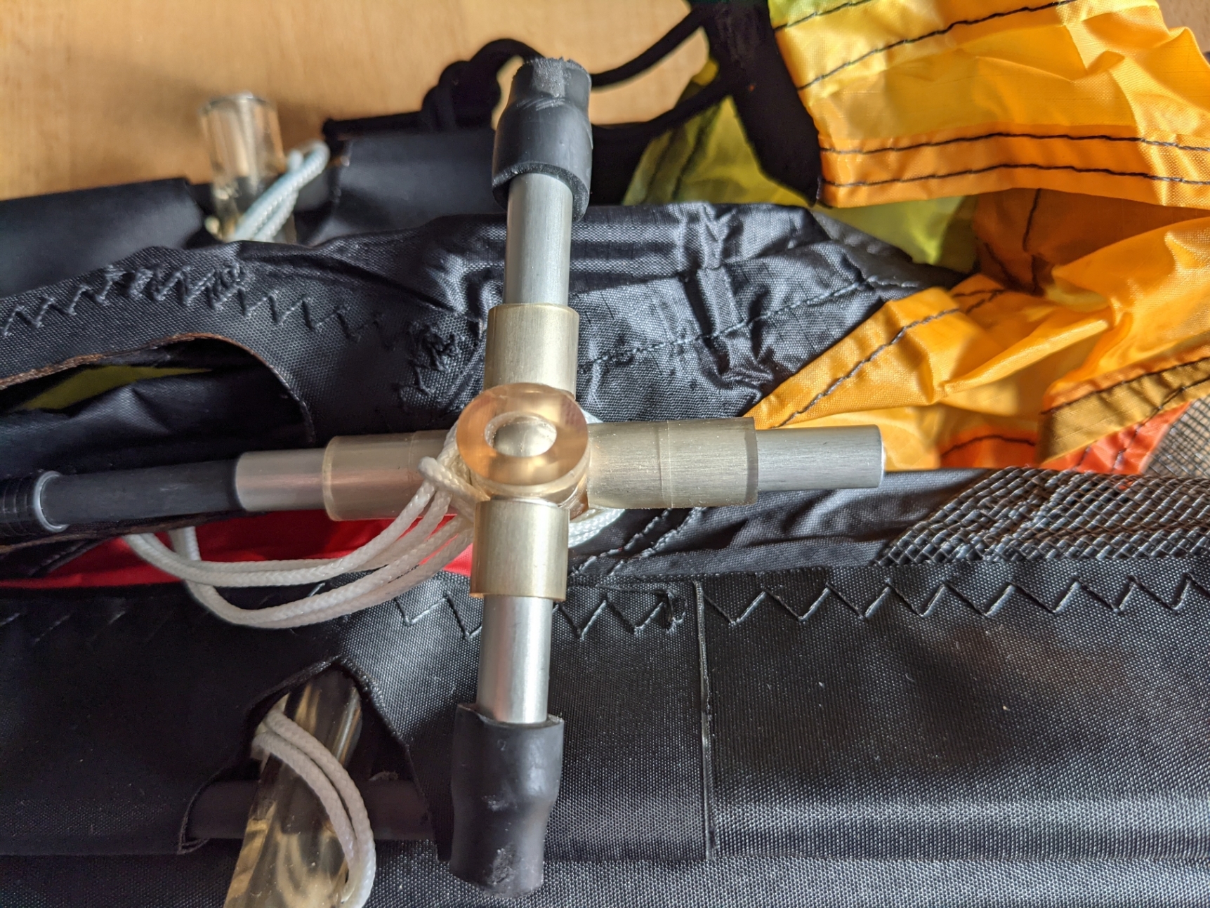Jepp, alles geschlossene Kappnähte. Die Verbinder sind mit Gewebeband gestoppt, bis ich die ideale Position gefunden habe - zumal dies ein Segel zum Üben war, das richtige wird dezentere Farben bekommen...