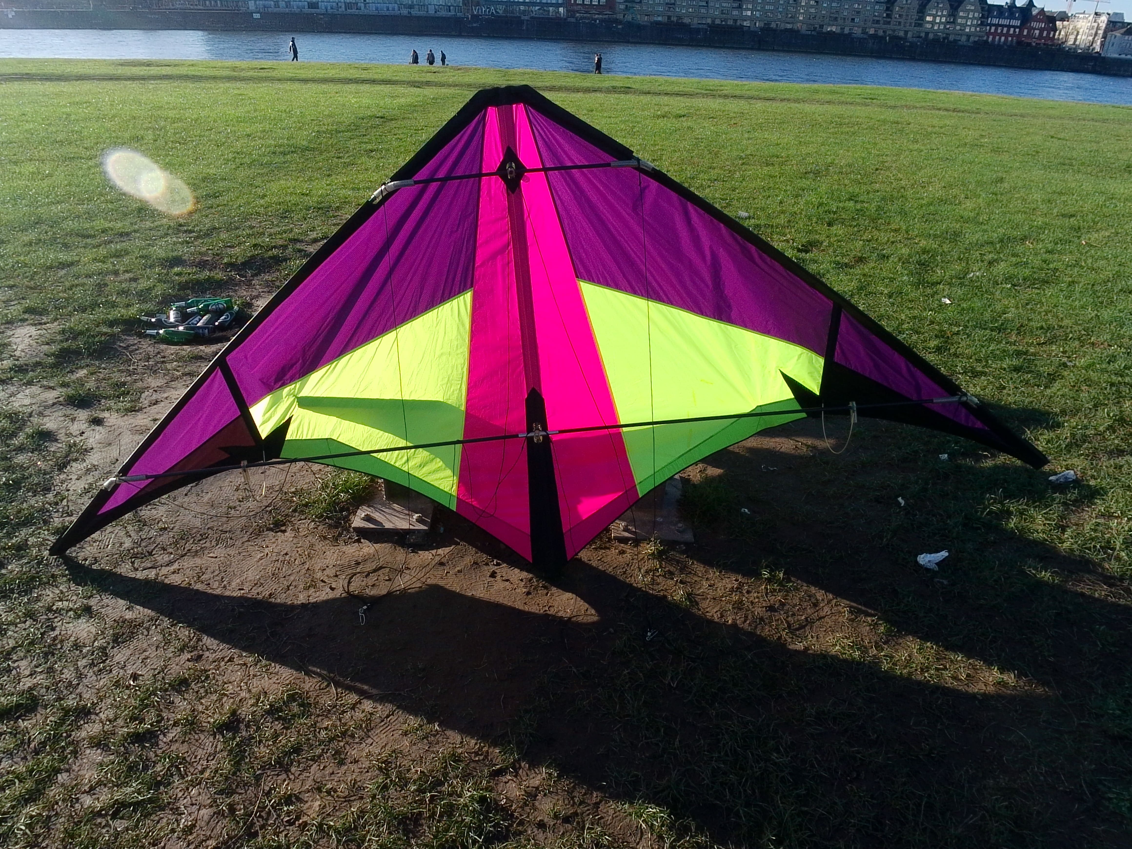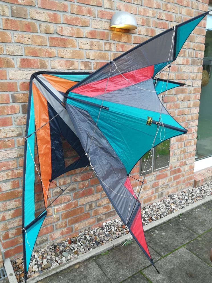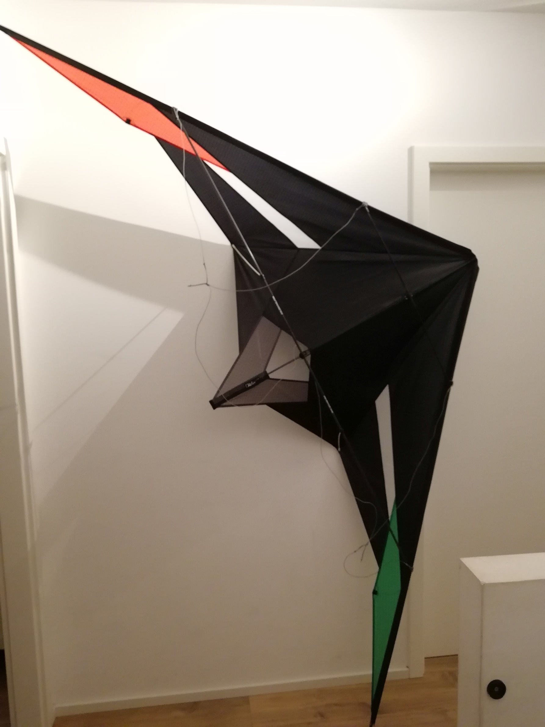 Also, das Startverhalten natürlich kettentypisch aufwendiger, insbesondere mit den Auslegern samt Windsäcken. Flugverhalten als Einleiner nahezu unmöglich - teilweise bestimmt durch meine damals noch schlechte Nähtechnik, aber vor allem eben durch den flachen Kopfdrachen, der sehr zickig ist so ohne Schwanz o.ä.