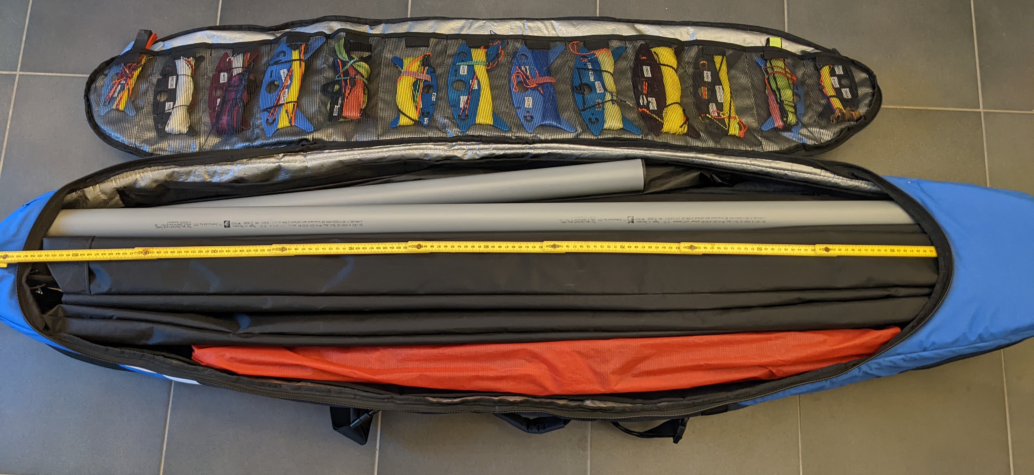 Aufgrund der zu geringen Länge für mich mit den Fullsize-Drachen ungeeignet, leider. Platzangebot, Zubehörfächer, Verarbeitung gefallen mir gut, aber das Risiko eines Schadens (besonders bei den empfindlichen Kites á la TT UL oder Masque (S)UL ist mir so einfach zu hoch.