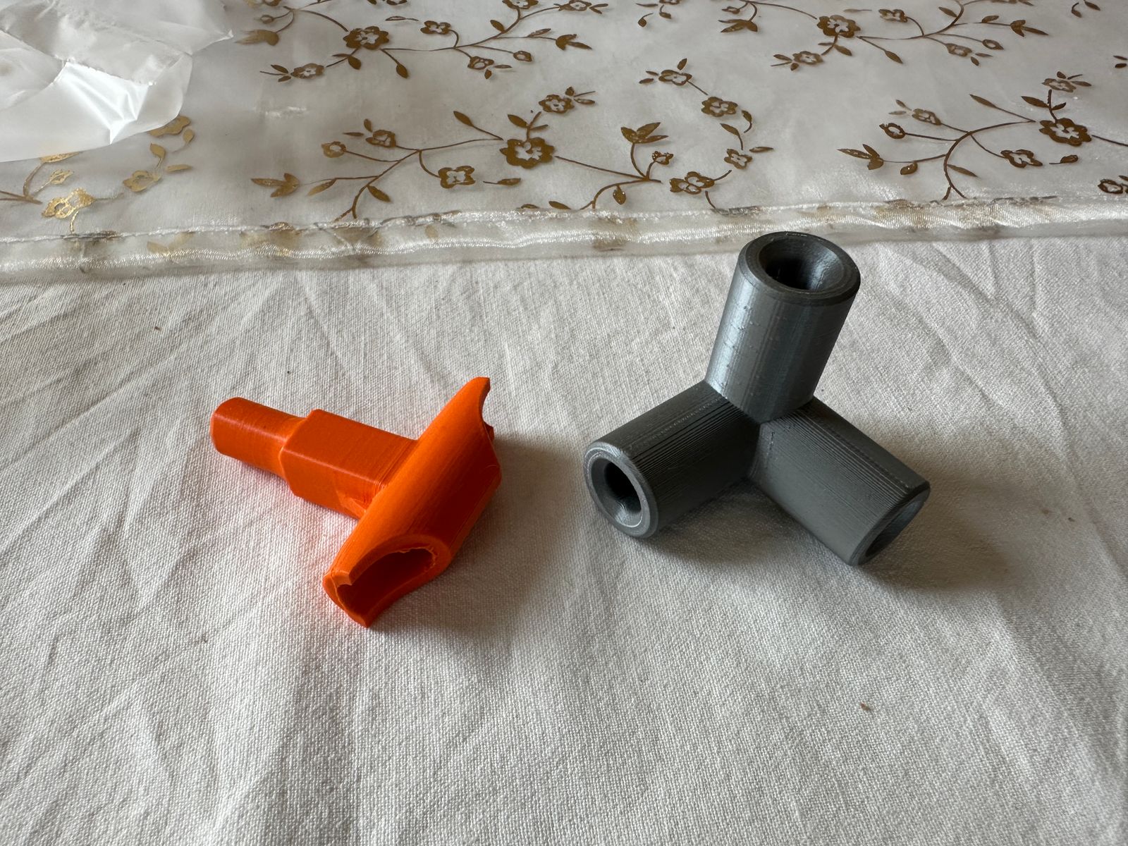 Ich glaube, das Teil hat versagt, weil ich eine falsche Belastung ausgeübt habe. Das Teil ist beim Abbau gebrochen. Ich habe nochmal geschaut, ich habe fast alle Kanten verrundet, um Belastungsspitzen zu vermeiden. Allerdings sind die Toleranzen sehr eng. Die Hülsen sind mit genau 8,0mm (und quer 10,0mm) konstruiert und dann gedruckt und ich brauche immer etwas Kraft, um die Stäbe in die Verbinder zu schieben/drücken. Gleiches beim Abbau. Ich bin mir sehr sicher, ich habe die 10mm Querstange gehalten, und dann an der 8mm Stange gezogen. Weil die Stange sehr fest im Verbinder sitzt, geht die ganze Kraft auf den Verbinder, dadurch auf senkrecht auf die Druckebene und belastet die Verbindung zwischen den Schichten. Idealerweise hätte ich den Verbinder gehalten, und dann den Stab rausgezogen.