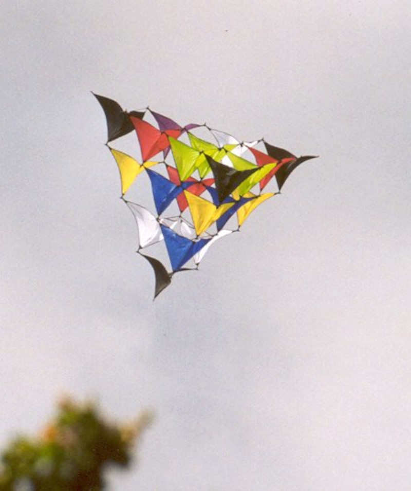 Die Befestigungsschlaufen an den Ecken möglichst kurz ausführen. Sonst wird es schwierig, gute Spannung in die Segel zu bekommen. Ich habe da leider nicht so drauf geachtet und auch noch Gummiringe aus einem Fahrradschlauch für die Befestigung verwendet. Das sieht dann im Flug so aus.
