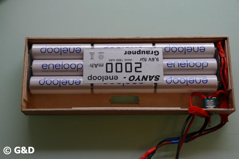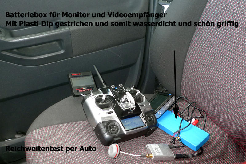 Zuerst aus dünnem Birkensperrholz eine Minikiste gebastelt für den Monitor/Videoempfängerakku. Die Box hat einen Schalter und wurde dann zum Abschluss mit Plasti Dip gestrichen. Das ist nicht sonderlich hübsch, jedoch wasserfest. Das ist mir wichtig weil die Box unten auf die Fernsteuerung kommt und ich nicht zimperlich damit umgehe wie ich mich kenne.;-) (nasse Wiesen, nasser Sand)