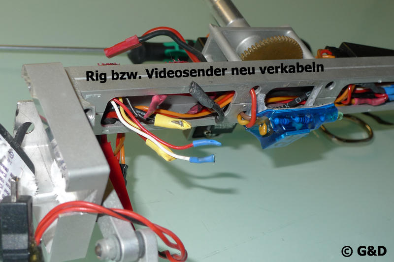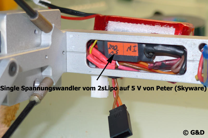 Da der neue Videosender nur 5 V benötigt musste ich einiges neu verkabeln und zum Einsatz kam auch ein 2. Spannungswandler von Skyware welcher mir aus dem 2 S Lipo am Rig schöne 5 V macht :H: Der 2. Wandler deshalb weil ich mir einbilde das dies wie ein extra Stromkreis ist und so Störungen durch Servos wie sie viele Kapfreunde haben ausbleiben. Zumindest hatte ich noch nie Störungen bei Servobetätigung, gesehen habe ich es aber schon oft.