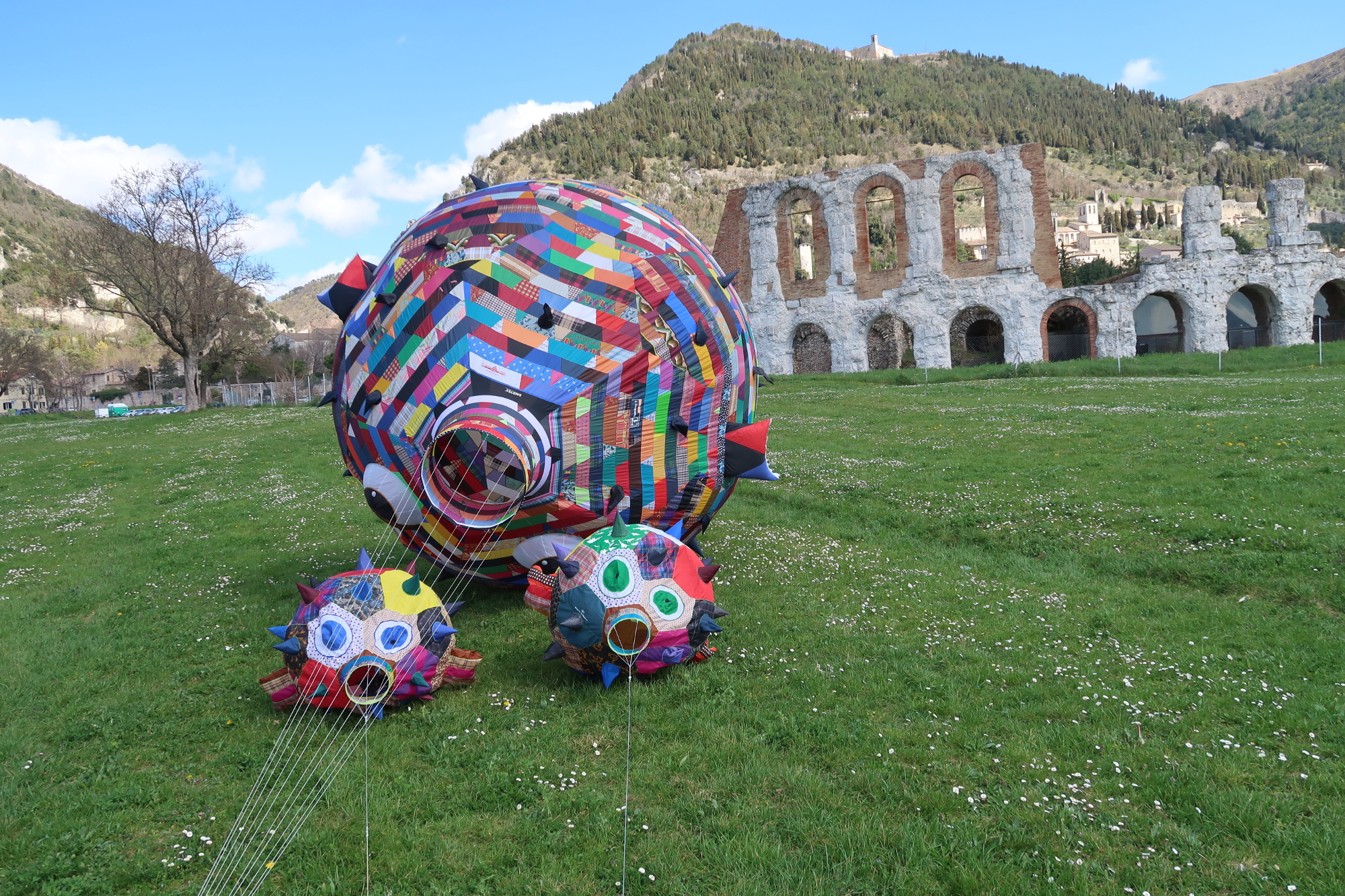 Vor dem Drachenfest bekamen die internationalen Drachengäste noch eine Stadtführung, bevor es zum Drachenfest auf ein großes Gelände beim römischen Amphitheater ging. Am Abend wurde ein umfangreiches Buffet beim Klubraum aufgebaut. Nebenan, in einer großartig ausgestatteten Werkstatt neben dem Klubraum, werden großartige Drachenskulpturen entworfen und genäht.die Raupe ist von Fabiano Vignali, der Calimero am linken Bildrand ist von Moreno aus Gubbio