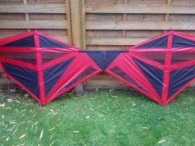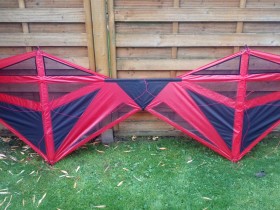 Das ist noch die Version ohne Fangschenkel an den äusseren Vertikalen. Da zieht sich das Segel noch zu sehr nach innen . Sieht man sehr gut auf dem vorletzten Bild. Und durch die verschließbaren oberen Gazefelder ist der Windbereich entscheidend nach unten gegangen.