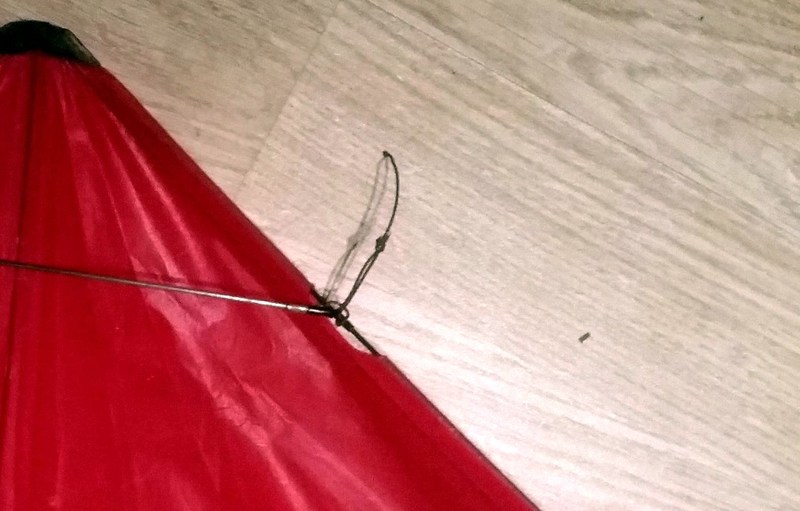 Ich dachte erstmal an Lösung 1, also ein Gummiseil plus dünnem Extratampen. DC301 habe ich halt da, weil ich damit zuletzt einige Flugleinen gebaut habe. Dünner ist ja nicht verkehrt, denn das Teil soll ja mit Spleiss durch das Loch passen.